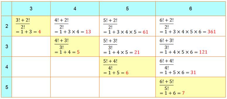 Produit On ne connaît que ces cas de la forme indiquée. Progression arithmétique Les trois cas connus: 0! x 1! x 2! = 2! 1! x 3! x 5! = 6! 1! x 3! x 5! x 7! = 10! |