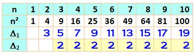 L'écart de l'écart entre carrés est constant et égal à 2. |