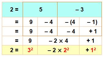 Note: on aurait tout aussi bien pu prendre d'autres valeurs: 2 = 19 – 17 = 100 – 2 x 81 + 64 = 10² – 2 x 9² + 8² |