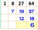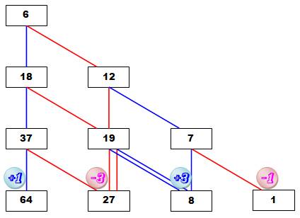 6 = 18 – 12 = (37 – 19) – (19 – 7) = ((64 – 27) – (27 – 8)) –