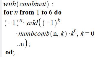 combinat. La boucle en n permet de calculer les six premières valeurs. La formule trouvée est directement traduite en Maple qui utilise la