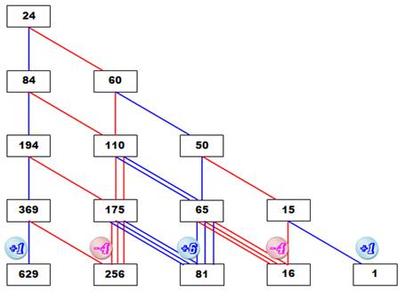 triangle de Pascal: un nombre est égal à la somme de celui du dessus et de son