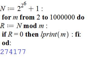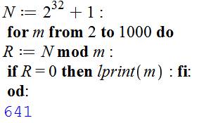 avec m qui prend toutes les valeurs de 2 à 1000 (c'est large). R est le reste de la division, cad. le modulo de N par m. Si ce reste est nul, on imprime la valeur de m. Seul résultat: m = 641. |