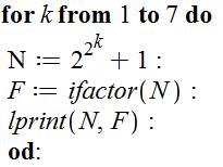 d'une instruction qui donne la directement factorisation (ifactor). Compte tenu de la quantité de chiffres (78 pour pour F8), la factorisation au-delà de F7