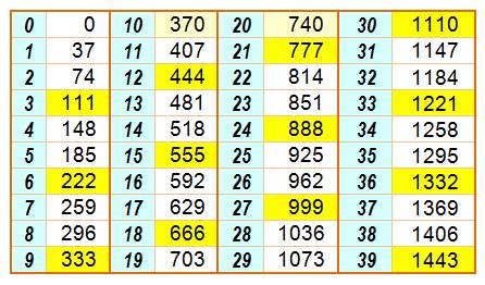 37 (ou multiples de 37): 1 chiffre: aucun. 2 chiffres: 37 et 74 3 chiffres: 111, 148, 185 … 222 … 333 … 999. Notez que: 11 multiples