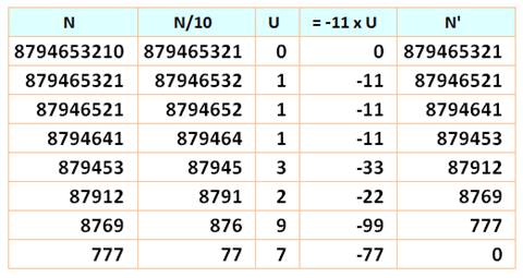 Subtract eleven times the last digit