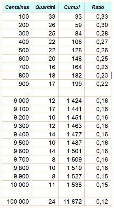 par tranche de centaines. Avec le cumul, on calcule le ratio nombres harshads sur