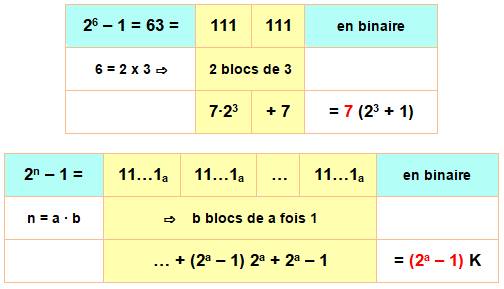 23 – 1 = 7 = 111En binaire: trois fois le chiffre 1 26 – 1 = 63 = 111111En binaire: six fois le chiffre 1 2n – 1 = 1111…1