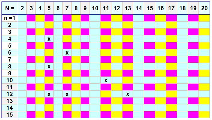 (cellule bleue avec petite croix) lorsque n est un multiple de 4