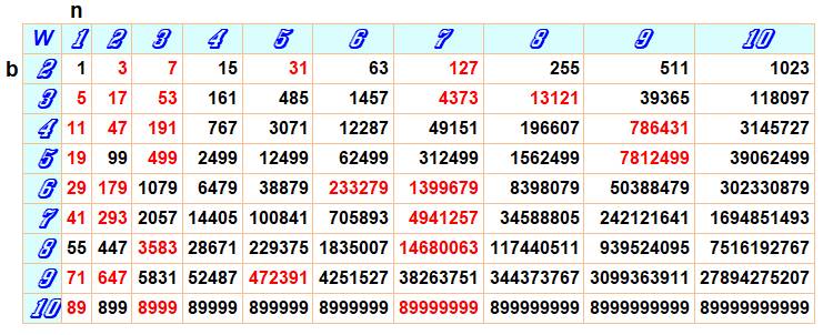 chaque base b, on note la valeur de n pour laquelle W est premier.
