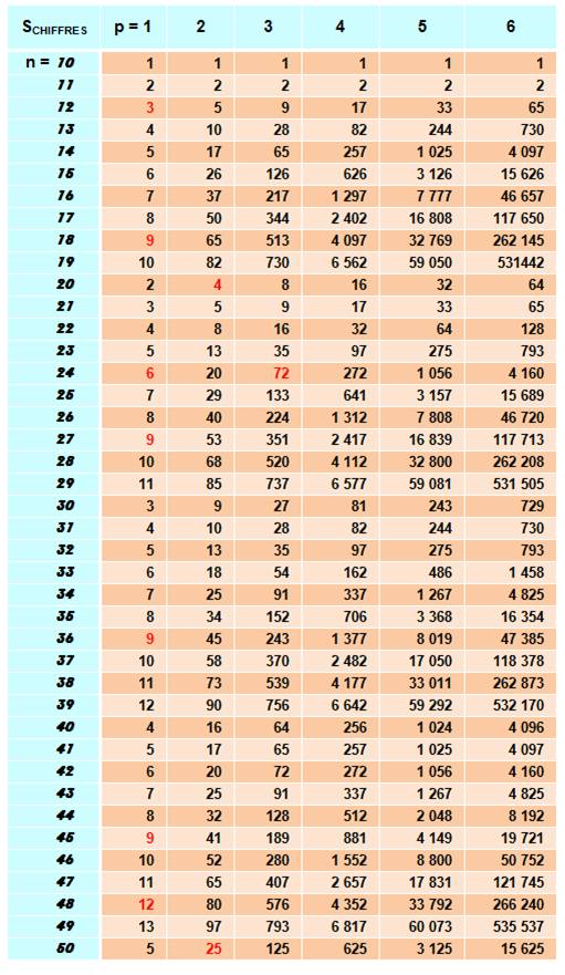 nombres n = 10 à 50 et la sommes de leurs chiffres à la puissance p. En rouge, les sommes multiples ou sous-multiples du