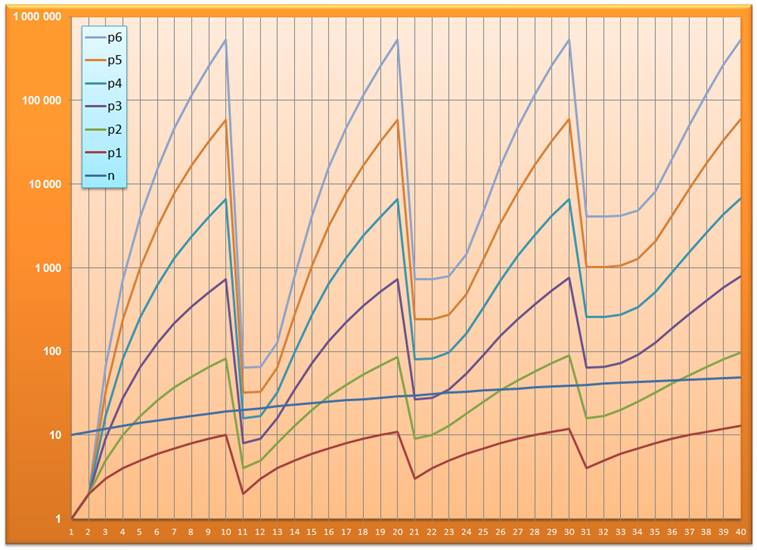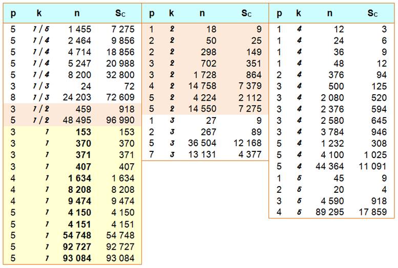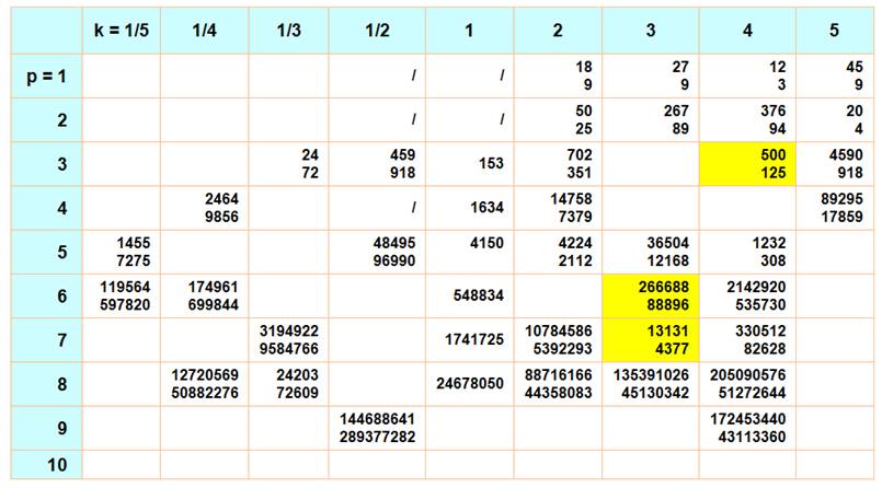 puissance p. En tête de colonne le rapport entier k entre N et S. Exemples