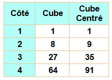 Liste des nombres cubiques centrés [n,Cubc] [2, 9], [3, 35], [4, 91], [5, 189], [6, 341], [7, 559], [8,