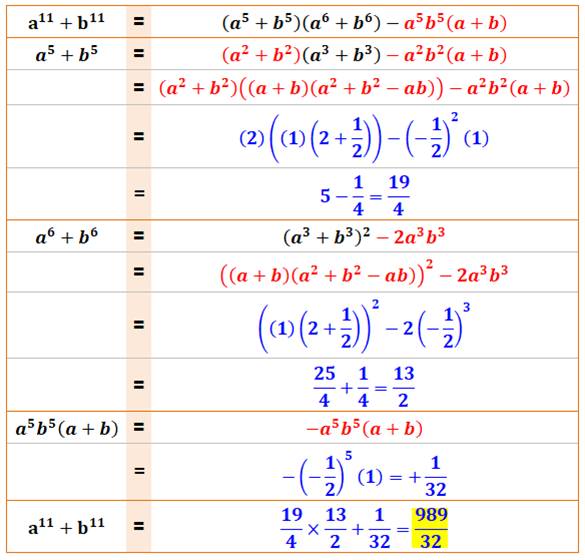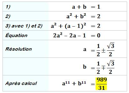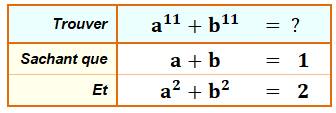 Problème On donne a + b = 1 et a² + b² = 2 Calculer la valeur numérique de a11 +