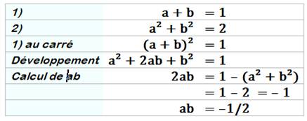 progressivement se ramener aux expressions connues: a + b = 1 a² + b² = 2 et ab = -1/2 |