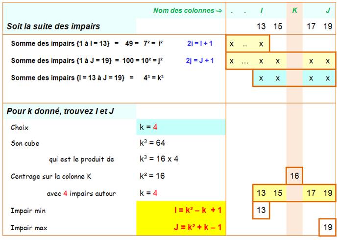 Théorème Le cube d'un nombre k est la somme des nombres impairs de k² - k + 1 à k² + k – 1 Les