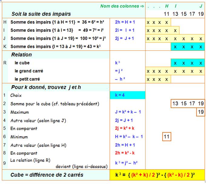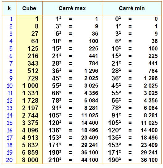 Théorème Le cube d'un nombre k est la différence des carrés de ½ (k²+ k) et ½ (k²– k). Valeurs