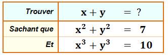 la somme de deux inconnues (x et y) connaissant la somme de leur carré et