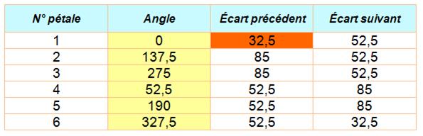 cet espacement de 137,5°. Voir Méristème apical Tableau