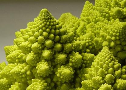 Le chou romanesco est constitué de spirales faites de petites pyramides coniques appelées florettes rappelant chacune la forme globale conique du chou entier. Et chacune de ces florettes est elle-même constituée de spirales faites de florettes coniques encore plus petites, et ainsi de suite. C'est cette propriété, où un même motif géométrique apparait partout et à toutes les échelles dans une forme (on parle d'autosimilarité), qui confère au chou romanesco son caractère "fractal" remarquable. |