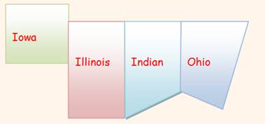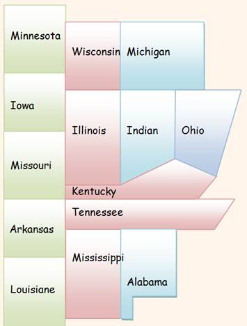 5 en bande Minnesota Iowa Missouri Arkansas Louisiane 5 en bande dissipée Wisconsin Illinois Kentucky Tennessee Mississippi et 4 pour faire 14 Michigan Indiana Alabama Ohio |