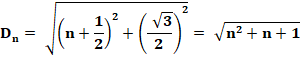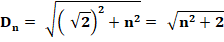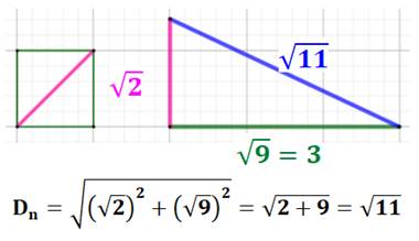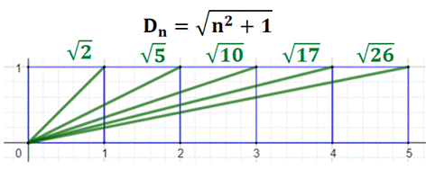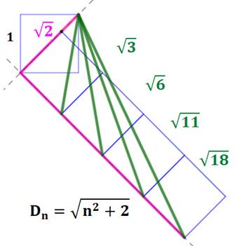 accolés. Les segments verts mesurent racine de n² + 2 avec n la quantité de carrés utilisés. La suite des nombres sous radical est : |