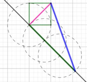 longueurs sont reportés sur les axes (arcs verts). Le segment (rose) qui joint les intersections