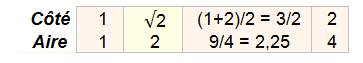 du petit carré multiplierait son aire par 4 et non par 2. Prendre une moyenne (1+2)/2 ne convient pas