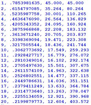 Tableau: n, angle en radian, angle en degré, et angle depuis l'origine. |