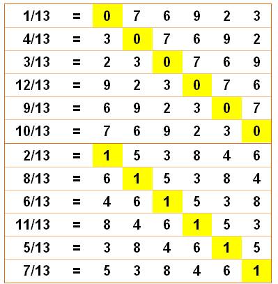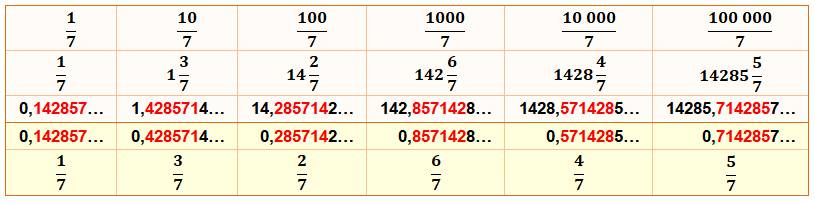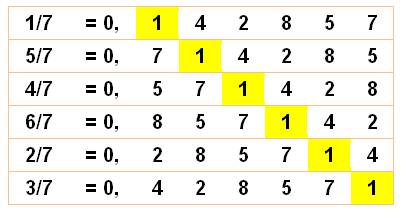 période (142857) est la même pour toutes ces fractions. Elle est simplement