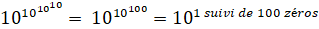 000 000 000 … Voir Puissances de dix Puissances de puissances On peut ajouter un étage de puissance. Voici un exemple: = 1 0000000000 0000000000 0000000000 0000000000 0000000000 0000000000