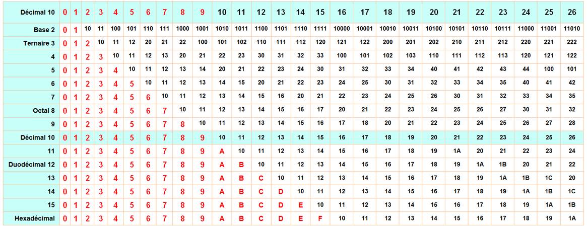 selon les bases de 2 à 16. Voir