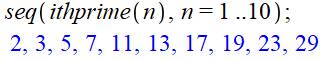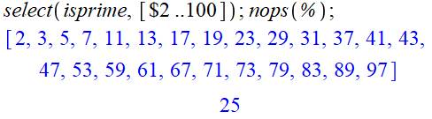 100. isprime, cherche les nombres premiers. select, extrait la liste des premiers. nops, compte les nombres premiers. Encore plus rapide
