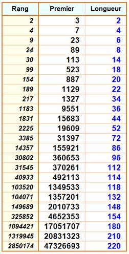 Record de longueur L = P(n+1) – P(n) Qté de nombres composés