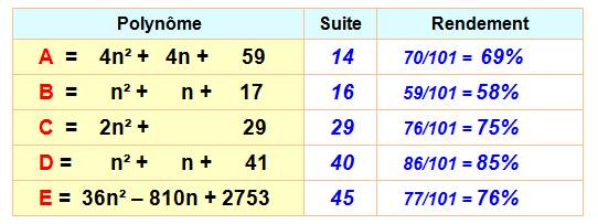 premiers successifs. Le rendement indique le pourcentage de premiers pour n