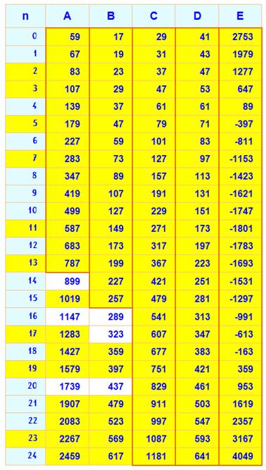 Exemple avec A = 12. P est premier pour: n = {2, 3, 5, 19, 97,