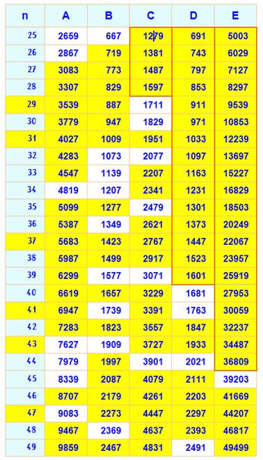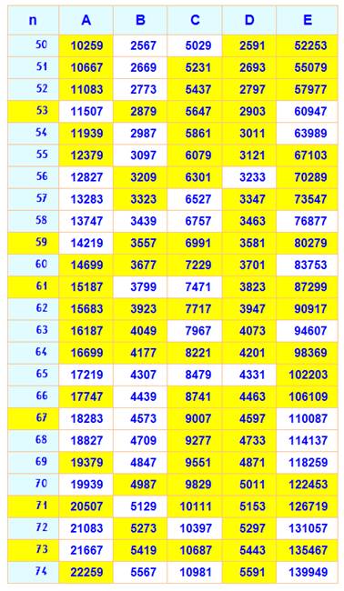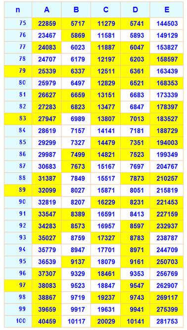 Liste pour A de 2 à 12 et n de 1 à 200 (0,3e5 veut dire 0,3 fois 10 à la puissance 5) |