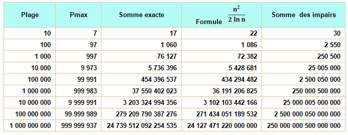présente les statistiques de sommes premières selon que les nombres dans