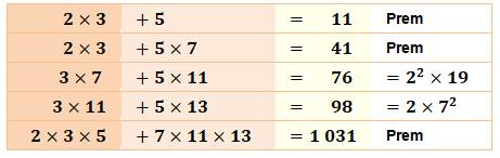 premiers >>> Ex: (3 x 7) + (5 x 11) = 76 = 2 x 2 x 19 qui n'est pas divisible par (3, 7, 5 ou 11). |