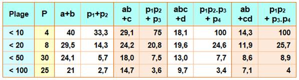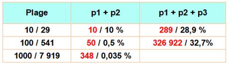 p1.p2 + p3 p < 10 => 9 / 12, 75 % p < 20 => 35 / 168, 20,8 % p < 50 => 102 / 1 365, 7,5 % p < 100 => 247 / 6 900, 3,6 % |