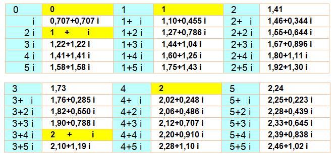 racine carrée de i = 1 + i; racine carrée de (3 + i) = 1,76 + 0,285 I; etc. Notez les valeurs