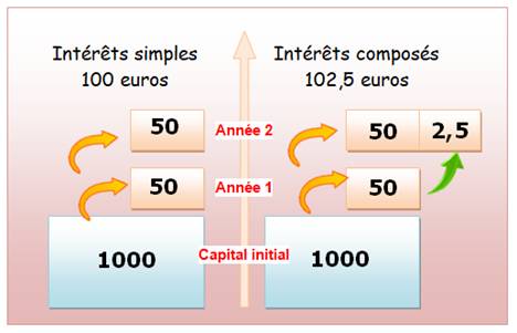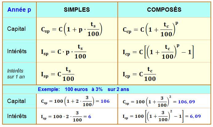 plaçant mon capital à 5 % en taux composé ou en taux simple sur 2 ans, la