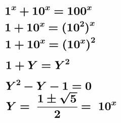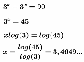 Sommaire de cette page >>> Calcul d’inconnues en exposants >>> Équation : 3^x + 3^x = 90 >>> Équation : 1^x + 10^x = 100^x |