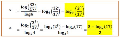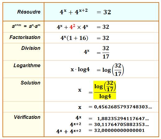 Programme # 1) Calcul de x et vérification import math a = 32/17 x = math.log(a)/math.log(4) print(x) s = 4**x + 4**(x+2) print(s) # 2) Calcul de x avec log base 4 from sympy import log x = log(32/17, 4) print("x =", x.evalf()) # 3) Résolution de l'équation from sympy import symbols, Eq, solve, N # Définir la
