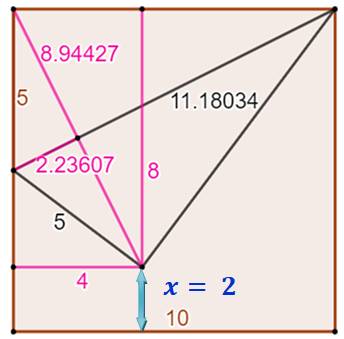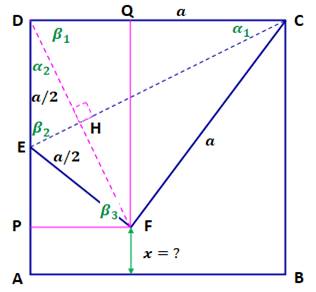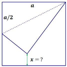 Construction Un carré de côté a. Un coin est replié jusqu'à la moitié du côté. Valeur de la distance x ? Principe de la solution géométrique