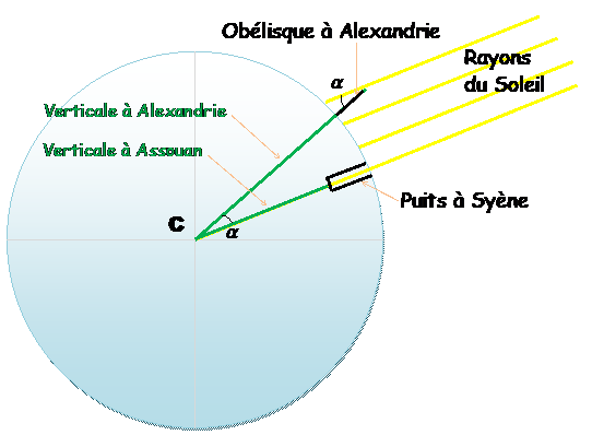 Syène (aujourd'hui: Assouan), ville située près du Tropique du Cancer – 24°N). Deux villes distantes de 842 km environ, valeur estimée
