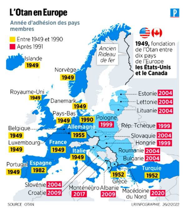 Estonie 10. États-Unis 11. France – hors défense intégrée de 1966 à1 991 12. Grèce1952 13. Hongrie1999 14. Islande 15. Italie |