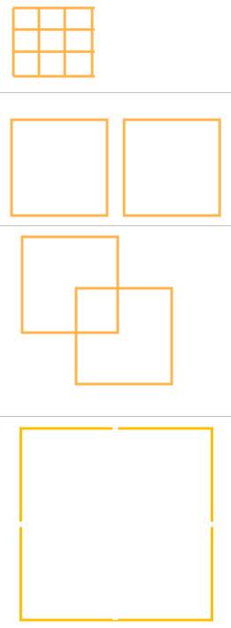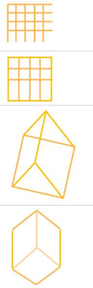 2 plus grands (c3) 15 carrés 8 C1/4 6 C1/2 1 C1 3 carrés formant un prisme 3 C1 en 3D 3 carrés formant un trièdre (ce n'est pas un cube) 3 C1 en 3D |