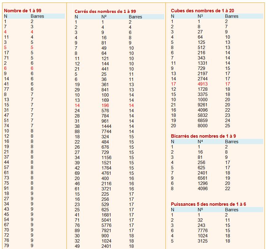 trouvera, ci-dessous, que le carré de 14 s'écrit avec 14 barres. Ainsi