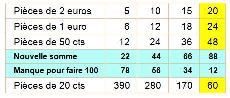compléter le tableau avec la quantité de pièces de 20 centimes pour combler